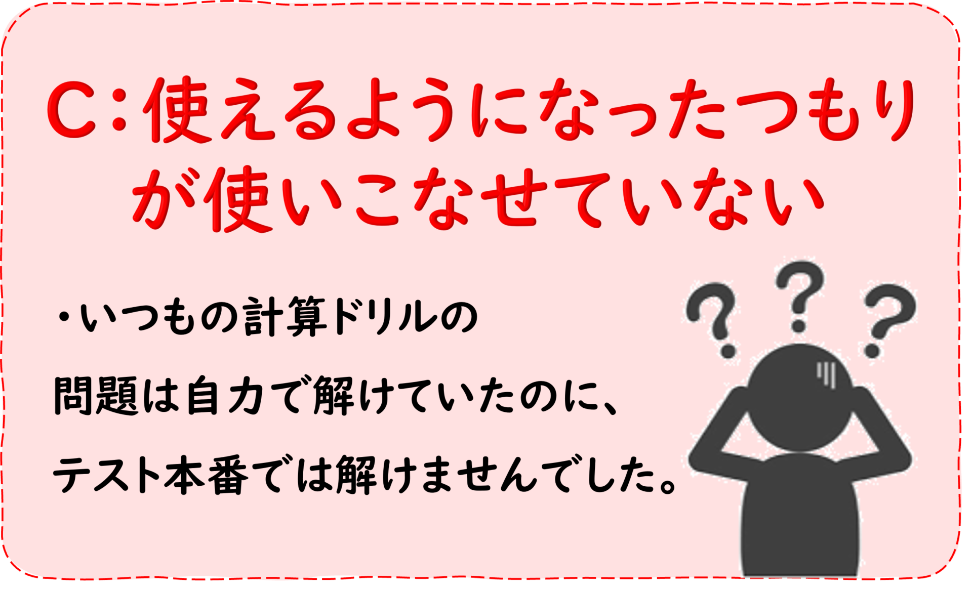 上のCの例では、知識を活用できる状態になったと思っていたが、そうではなかった、というのが問題でした。
