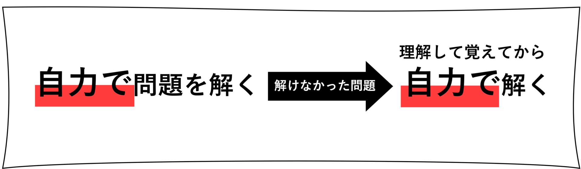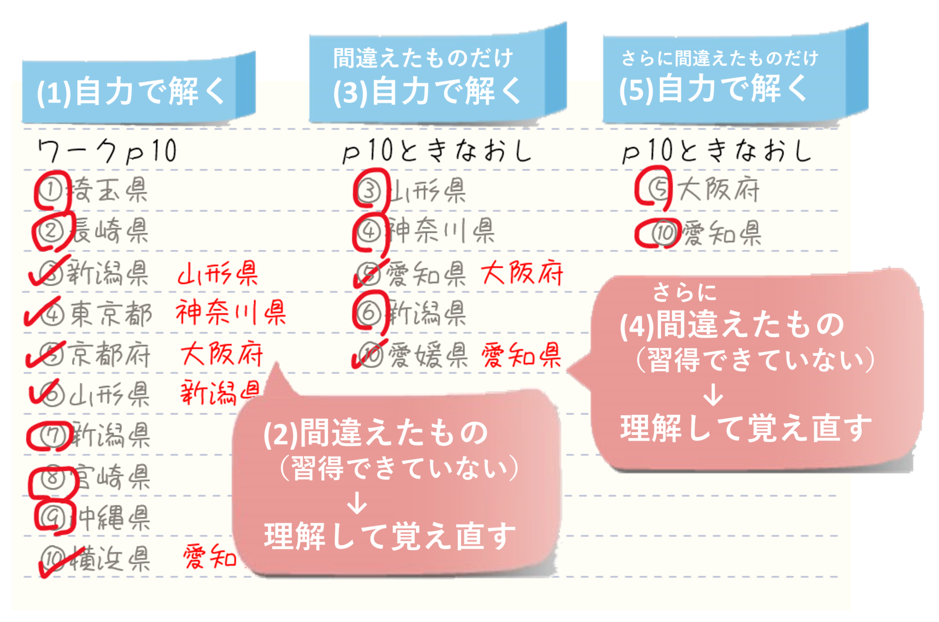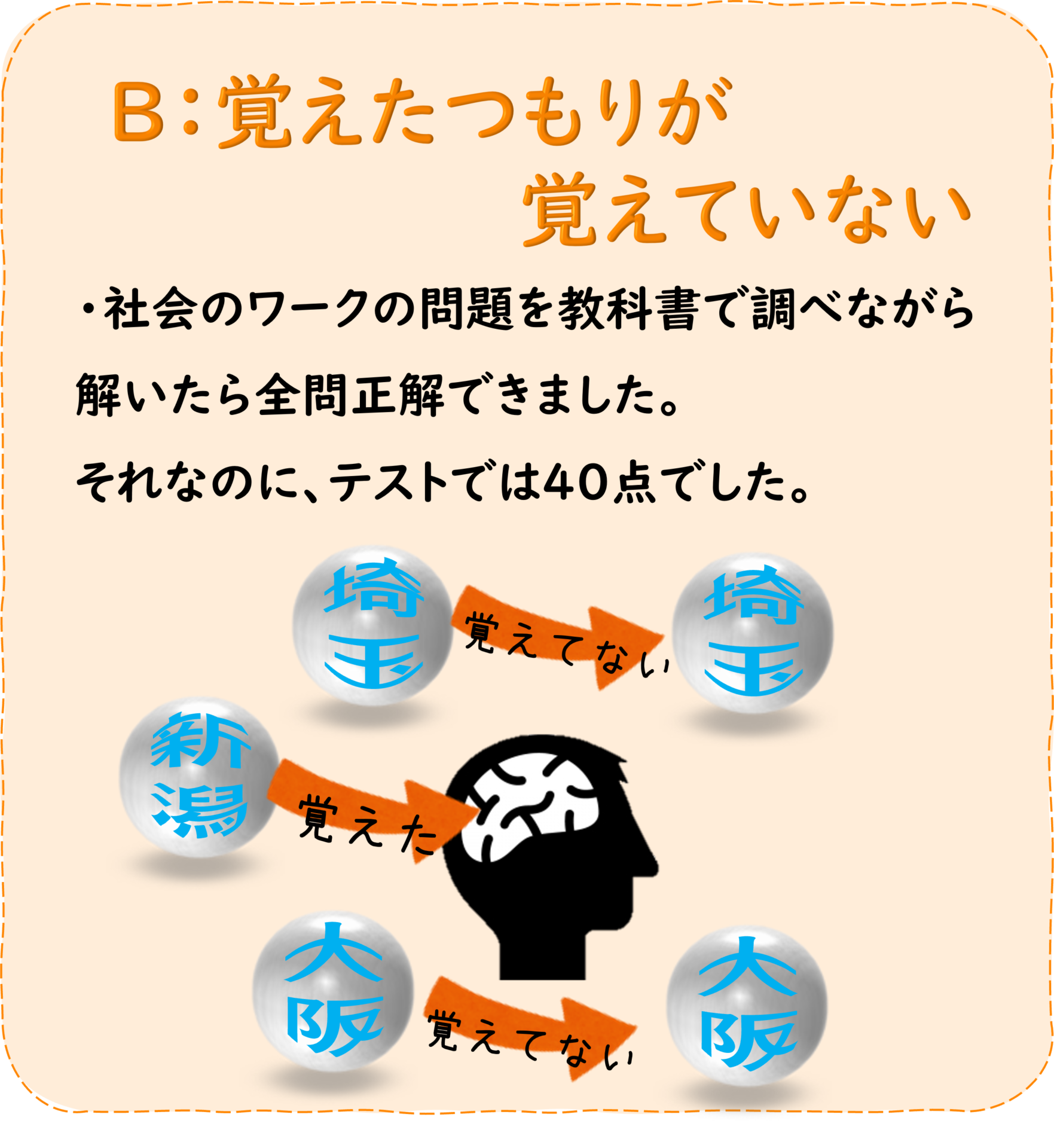 「調べながら解く」というやり方は、理解はしやすいですが覚えてはいない場合があります。上の図のように、たまたま覚えるものもありますが、覚えていなくても、その時だけは解けてしまうので、「覚えた」と錯覚します。