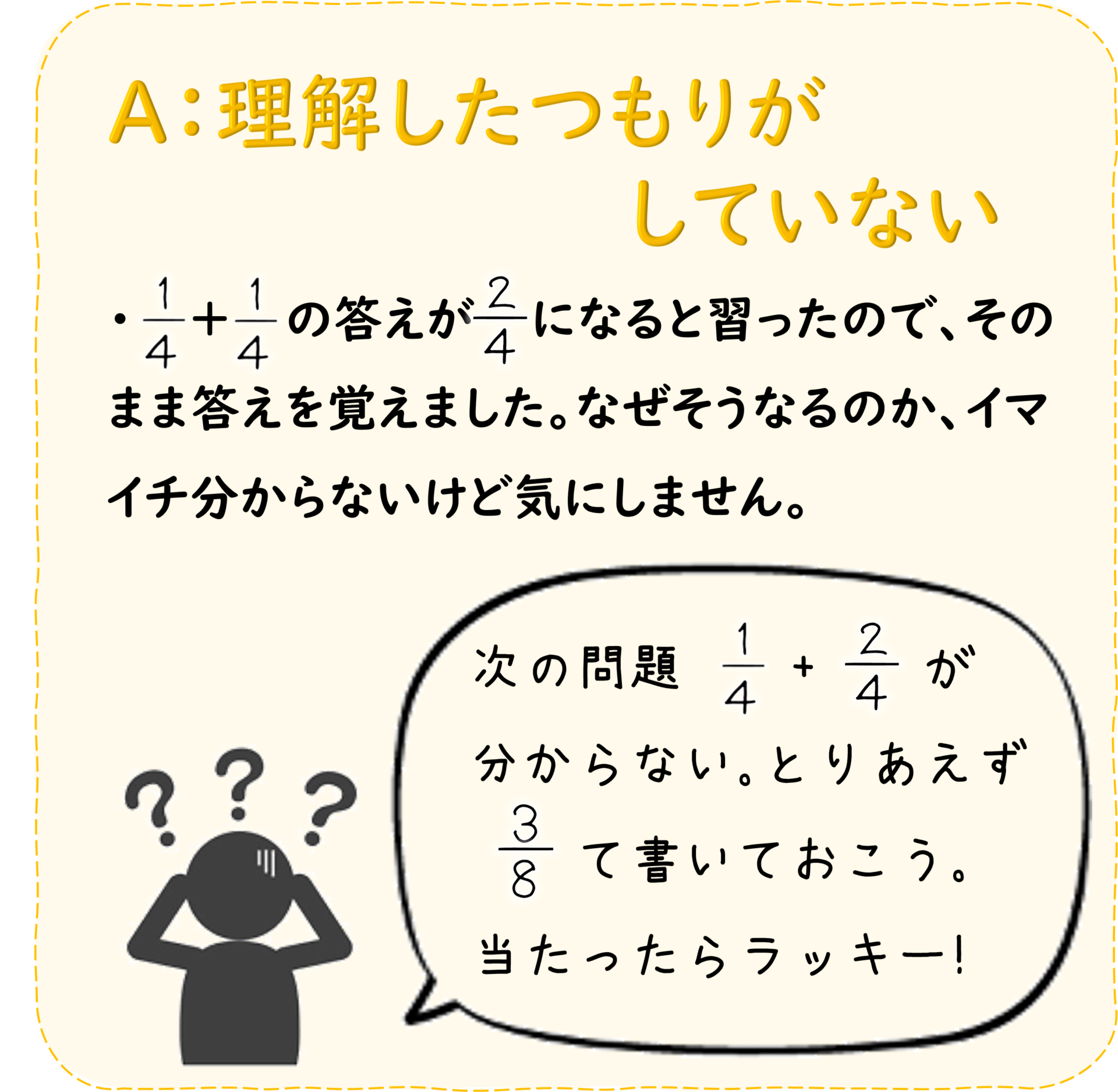 答えを丸暗記しても、そもそも分数のしくみを理解していないと、似ている問題や応用問題が出ても対応できません。