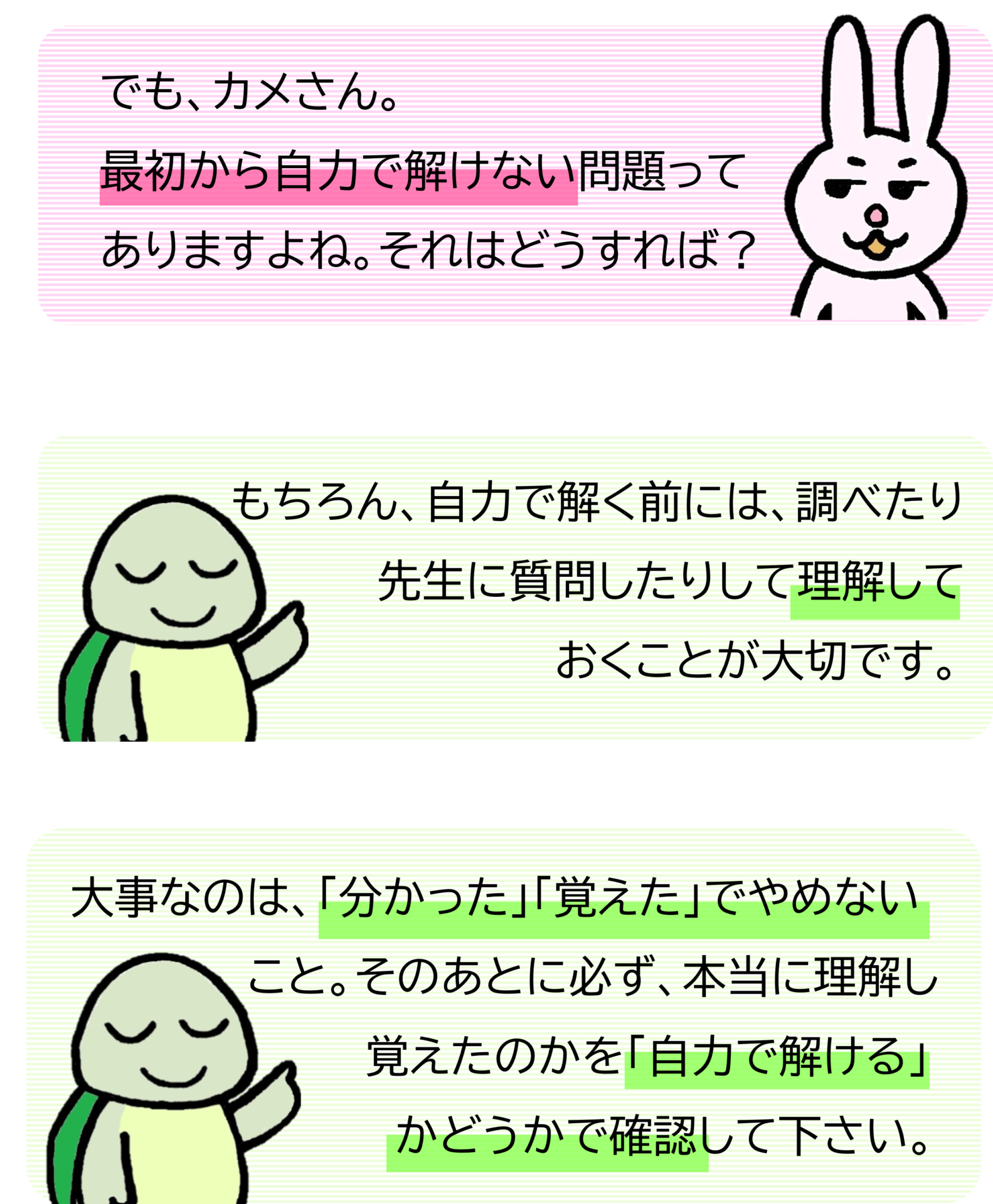 「自力で」というのは、教えてもらったり、教科書やタブレットなどで調べたりしないで解くということです。