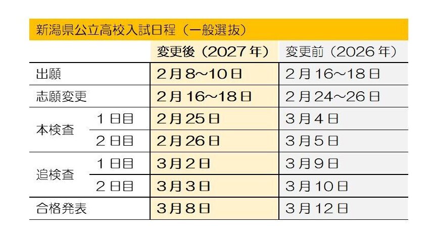 さて、新潟県教育委員会は2027年春以降の公立高校入試(現中学2年生の入試)の一般選抜日程を、現在の3月上旬から1週間ほど早め、2月25日を目安に行うと発表しました。