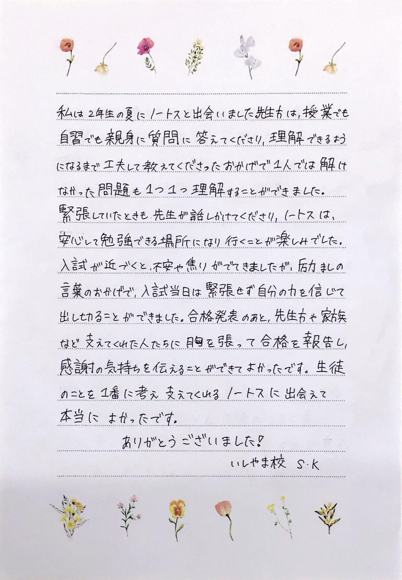公立高校入試を終えて、今日はノートスいしやま校Kさん直筆のメッセージをご紹介します。